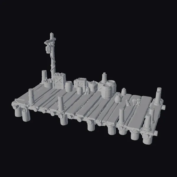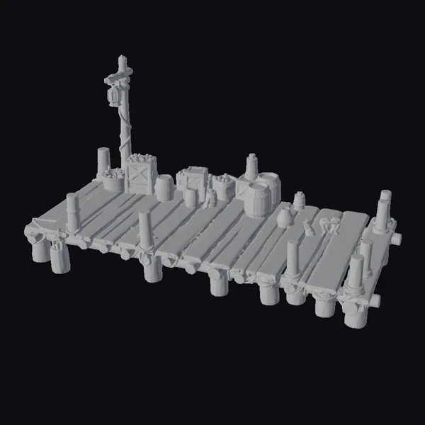 Perched on stilted pillars, this detailed dockside still life boasts a richly textured, dark wood platform. A vintage lamppost rises from the left, casting a warm glow on the assortment of wooden barrels, crates, and scattered goods. The dock’s rustic charm lies in its weathered planks and pilings, complemented by an array of industrial and nautical elements. Ideal for adding a touch of realism to games, 3D environments, or animation projects, this model shines in applications requiring authentic, high-detail settings. From film and architectural visualizations to VR/AR experiences, its unique blend of textures and mood will captivate audiences.