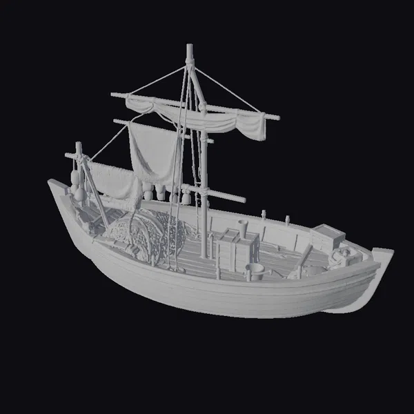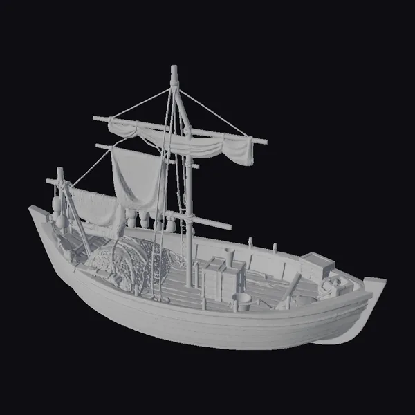 Perched on the edge of the horizon, this meticulously crafted fishing boat model appears ready to set sail at a moment’s notice. The wooden hull, bearing the scars of time, is complemented by a faded blue stripe that runs along its length. A makeshift mast, rigged with ropes and a canvas sail, stands tall amidst a jumble of fishing gear, including vibrant buoys and dense fishing nets. The deck, strewn with wooden crates and other nautical paraphernalia, invites the eye to explore every nook. Whether destined for use in a maritime animation, a coastal scene in a game, or as a detailed model for architectural visualization, this boat promises to add a touch of authenticity. Its potential applications span across various mediums such as 3D printing, virtual reality experiences, and detailed architectural visualizations.