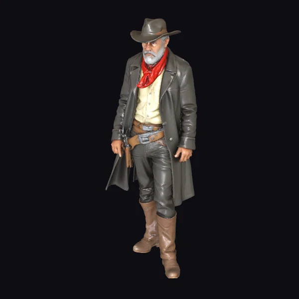 Standing with a slight lean, the gunslinger’s pose exudes a sense of quiet confidence. His weathered face, complete with a graying beard and serious eyes, tells the story of countless days under the sun. The worn leather of his coat and boots is meticulously detailed, with visible creases and scuffs that add to the model’s realism. A brown cowboy hat tops his head, while a red bandana adds a splash of color to his outfit. The holstered pistol at his hip is at the ready, suggesting a man prepared for anything. This model is perfect for use in games, animation, or 3D printing, offering a wealth of creative possibilities.