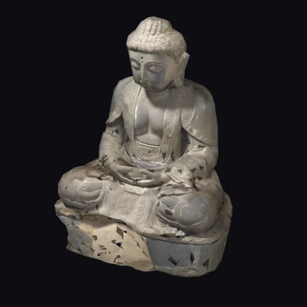 Crafted with precision, this weathered stone Buddha statue sits cross-legged on a worn pedestal, its body language conveying deep meditation. The statue’s surface exhibits signs of aging, with subtle cracks and weathering that add to its historical charm. The serene face, with eyes cast downward, embodies the essence of Buddhist tranquility. Intricate patterns adorn the stone robe, meticulously carved to reflect the artisan’s devotion to detail. This model is perfect for projects requiring a touch of ancient wisdom and peace, suitable for use in games, 3D printing, VR/AR experiences, animations, and designs that seek to evoke a sense of calm and historical depth.