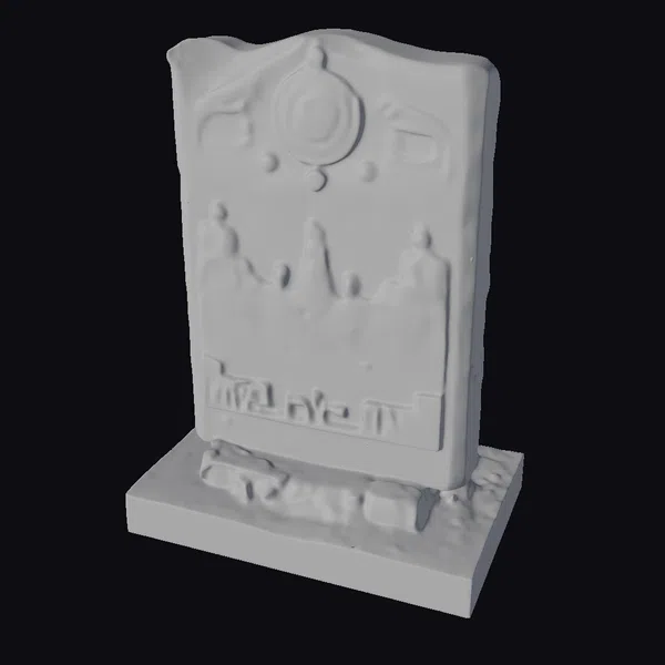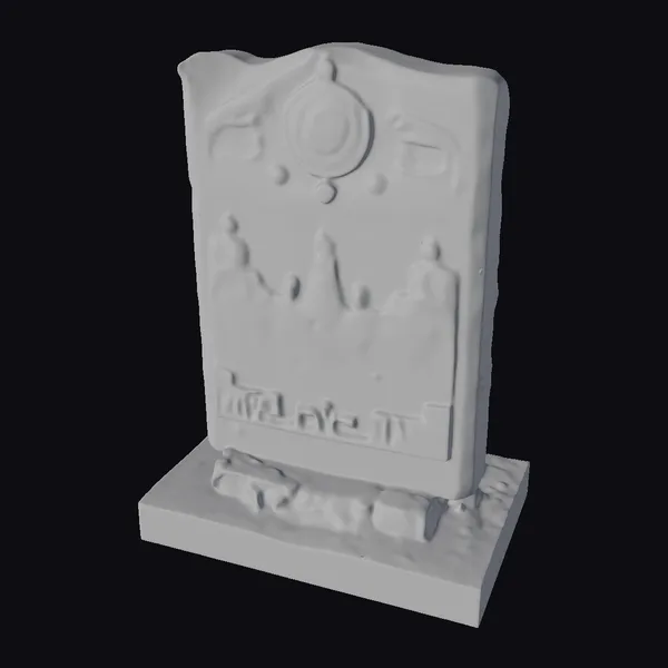 Crafted with meticulous detail, this stone slab stands proudly on a base, its surface bearing the weight of time with a weathered, moss-covered exterior. The main panel showcases a deeply carved scene of farmers presenting their harvest, with tools and robes intricately detailed. On one side, a transformation is carved, telling another story. The slab’s top is adorned with a circular symbol, possibly an ancient rune or emblem, adding to its mystique. The base, too, is crafted to resemble stone, with moss creeping up its edges, grounding the monument in the earth. This model is perfect for use in historical, fantasy, or educational projects, offering a rich, detailed asset for 3D rendering, animation, or virtual reality applications.