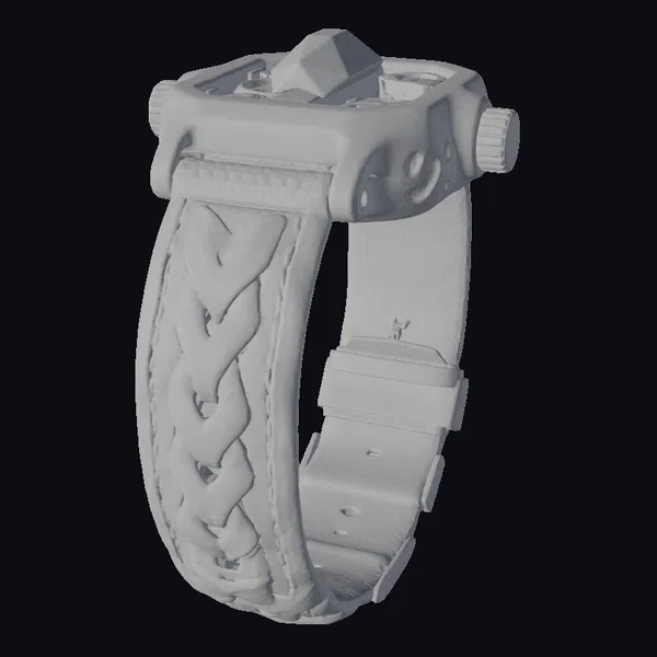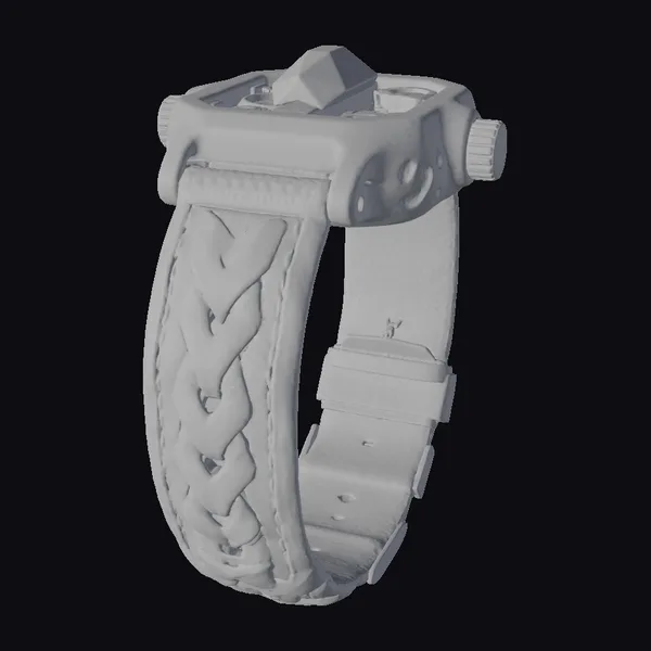 Perched on a wrist, this intricately designed watch boasts a base crafted from weathered, bone-colored ceramic, giving it an ancient, worn look. At its heart lies a dark obsidian time-crystal, radiating an otherworldly glow. The leather strap is a marvel of design, with a braid of red, heart-shaped motifs on a purple background, secured by metal bands. Light catches the strap’s textured surface, highlighting the craftsmanship. Ideal for games, 3D printing, VR/AR experiences, animation, and design projects, this model brings a touch of sci-fi fantasy to any creative endeavor.