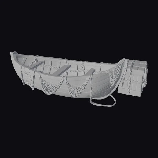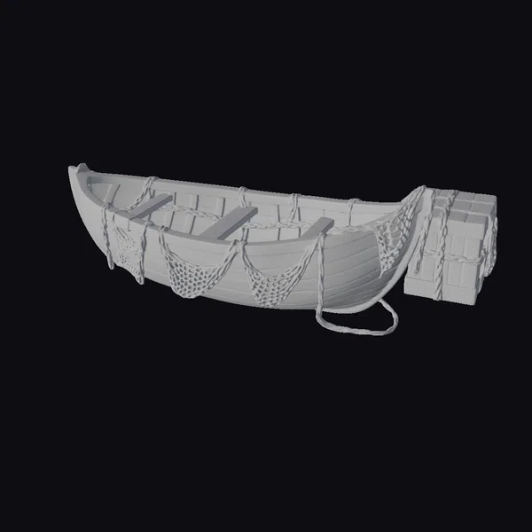 Positioned at a slight angle, the boat’s worn wooden hull gleams with a soft, aged patina. The interior features several wooden slats, likely used for support or as seats, and is partially covered with a weathered fishing net. A sturdy rope, wrapped around the boat’s edge, adds to its rugged charm. A wooden crate, bound with ropes and netting, rests beside the boat, suggesting a vessel used for both transportation and storage. The boat’s green-tinged hull, combined with its rustic wooden elements and detailed rope work, makes it an ideal model for projects requiring a vintage, seafaring aesthetic. Perfect for use in games, animations, or 3D designs where a touch of rustic nostalgia is desired.
