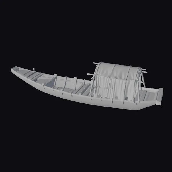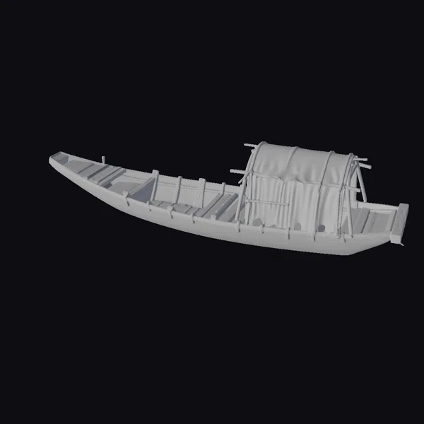 Positioned in a gentle curve, the boat’s wooden hull is meticulously detailed with visible planks, ribs, and a sturdy frame. The bow tapers to a point, while the stern features a raised, covered section, likely serving as a shelter or storage space. The wooden slats are weathered to a soft, silvery brown, with darker streaks suggesting years of exposure to the elements. As the light catches the boat, it highlights the intricate textures of the wood and the craftsmanship that went into its creation. Ideal for use in games, 3D printing, VR/AR experiences, animation, or architectural designs, this model brings a touch of rustic charm and history to any project.