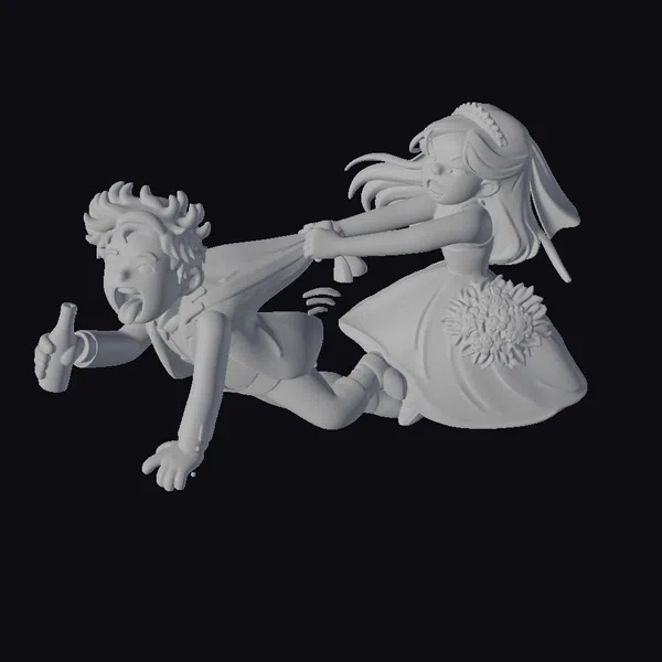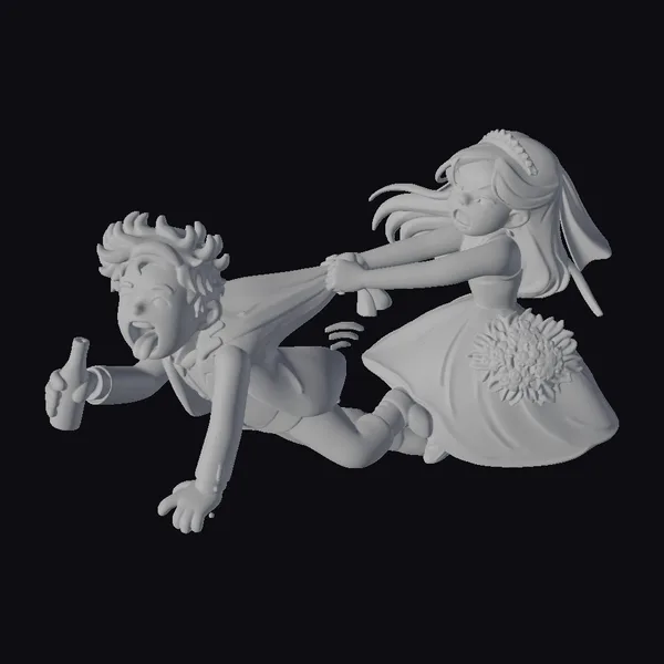 In a moment that defies traditional wedding decorum, a bride and groom are suspended in mid-air, showcasing a comedic, action-packed scene. The groom, with his tongue out and a green bottle in hand, appears to be in a state of joyful surrender. The bride, with her long black hair flowing behind her, grips the groom’s suit, her face set in a determined, playful expression. The detailed textures of their outfits—the sleekness of the groom’s tuxedo, the intricate bouquet and veil of the bride—add depth to this cartoonish scene. This model is perfect for projects requiring a light-hearted, humorous touch, such as animations, games, or any form of visual media looking to capture a moment of whimsy and fun.