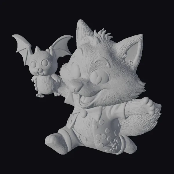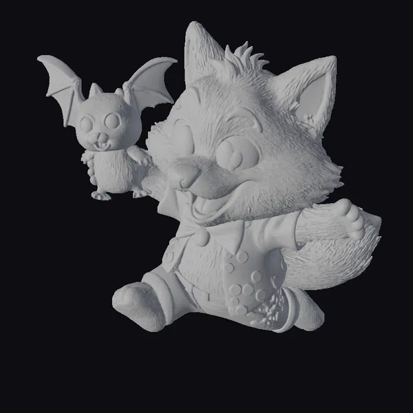 In a dynamic pose, the chibi werewolf appears to be mid-jump, exuding excitement and joy. Its gray fur is complemented by a white face, black nose, and distinctive eyebrows. The werewolf’s outfit is a treat for the eyes: a red shirt with colorful polka dots, a bright yellow collar adorned with green spots, and blue pants. By its side is a cute brown bat toy with large eyes and a cheerful expression. The model’s rounded proportions and thick, toy-like details evoke a sense of whimsy. Textures are smooth and cartoonish, with subtle shading that enhances the 3D effect. Lighting is soft and even, bringing out the model’s playful features. This model is perfect for games, animations, or 3D printing projects that require a fun, fantasy element.