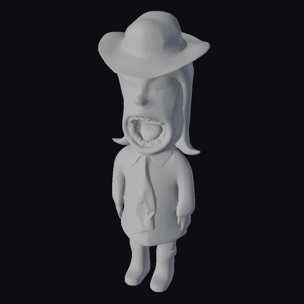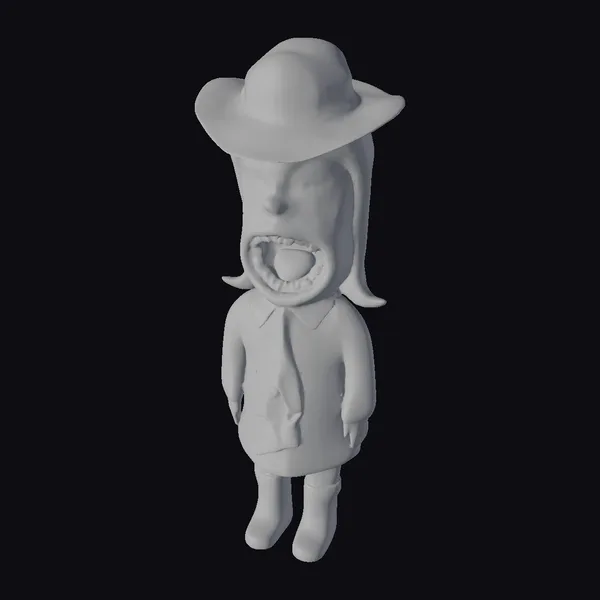 Standing tall with an air of mystique, this stylized figure presents a fascinating dichotomy. The upper half of its body, clad in a sharp black suit, complete with a vibrant tie and a hat that adds a touch of sophistication, exudes a calm demeanor. Meanwhile, the lower facial features morph into a set of comically exaggerated teeth, creating a jarring contrast that is both intriguing and amusing. Crafted with attention to detail, from the texture of the suit to the sheen on the hat, this model is perfect for projects requiring a touch of whimsy and surrealism. Its unique design makes it an excellent choice for animations, games, or any creative endeavor looking to add a character that stands out.