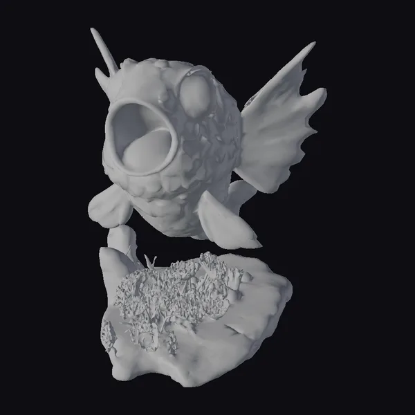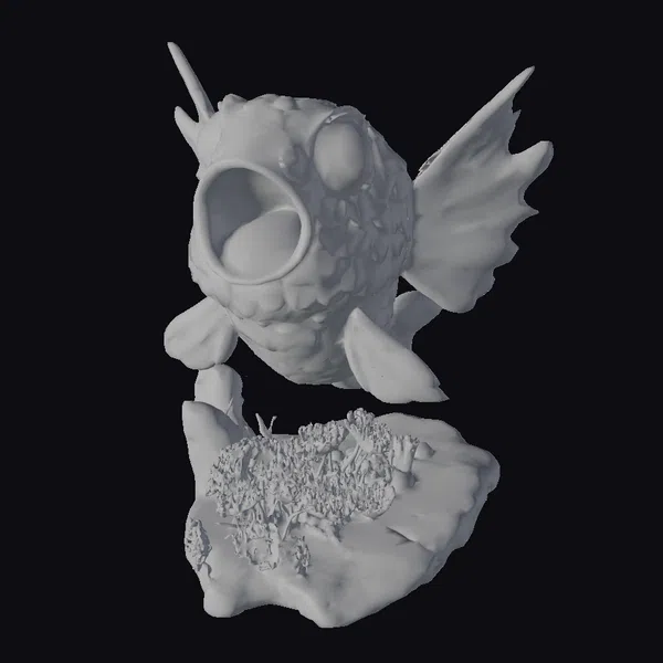 In a dynamic pose that captures the viewer’s attention, a stylized fish sculpture appears to burst from the confines of its rocky perch. The fish’s body is a mesmerizing mosaic of blue and orange scales, gradating from light to dark, with a large, expressive eye and an open mouth revealing a glimpse of its inner world. The rock base, adorned with coral and sea anemones, provides a naturalistic setting that grounds the fantastical creature. This sculpture is perfect for adding a touch of whimsy to any room or as a unique asset for games, animation, or VR/AR projects. Its detailed textures and vibrant colors make it a standout piece that invites imagination and creativity.