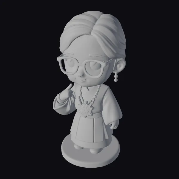 Detailed with precision, this cartoon character bust presents a lively figure with brown hair styled neatly, donning black glasses and a bright smile. Her outfit is a kaleidoscope of colors, featuring a teal shirt, a red vest with a golden sun emblem, and a striped skirt. Accessories include a layered necklace, dangling earrings, and gold bracelets, all meticulously rendered. The character stands on a simple brown base, inviting the viewer to imagine her in various scenarios, from animation and games to print and VR/AR applications.