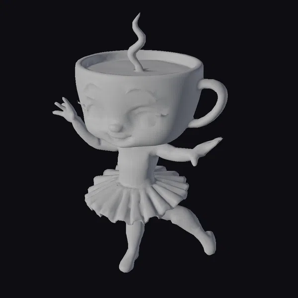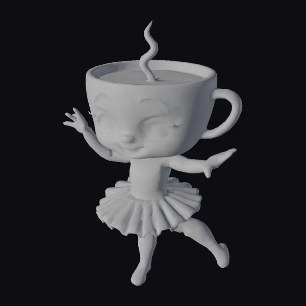 In a majestic pose, this stylized ballerina- tea cup hybrid stands out with her body seamlessly merging into a delicate tea cup, complete with a handle and a swirling steam rising from the top. Her face is adorned with rosy cheeks and detailed eyelashes, adding to her charm. The tutu around her waist is intricately designed, with each fold meticulously crafted. The entire model is a marvel of artistic creativity, perfect for use in games, 3D printing, VR/AR experiences, animation projects, or as a unique design element. The level of detail, from the texture of the ‘porcelain’ to the dreamy expression, makes this model a standout.