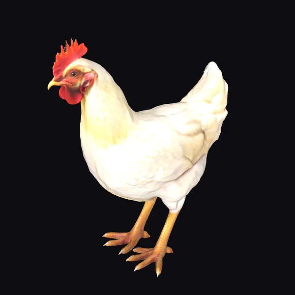 Positioned in a dynamic stance, this highly detailed white chicken model showcases a beautiful blend of white feathers with subtle yellow undertones. The sharp, bright red comb and wattle add a pop of color, while the yellow beak and orange legs provide a natural contrast. The model’s realistic texture and feather detailing make it an excellent choice for projects requiring an authentic farm animal appearance. Ideal for use in animations, games, and 3D environments where a lifelike chicken is needed.