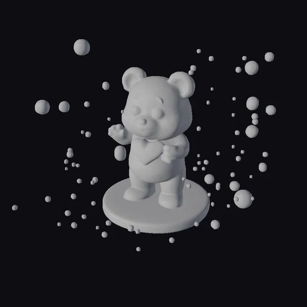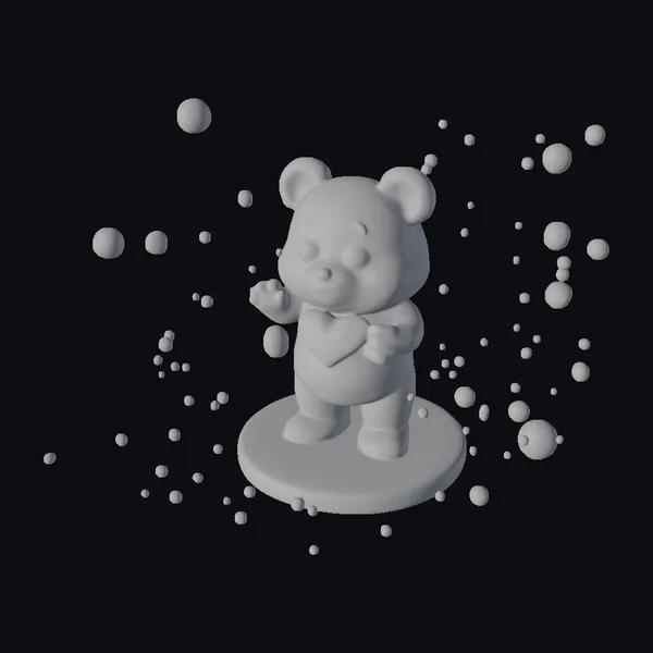 Positioned dynamically on a round, speckled base, the white chocolate teddy bear is captured in a playful pose, with one paw raised as if dancing among the bubbles. The model’s surface is adorned with a delicate texture, mimicking the appearance of white chocolate, and is speckled with gold and other colors to enhance its festive appeal. The golden bow around its neck adds a touch of elegance, while the surrounding bubbles create a lively atmosphere. This 3D model is ideal for use in games, 3D printing, VR/AR experiences, animation projects, and design visualizations, offering a unique blend of whimsy and sophistication.