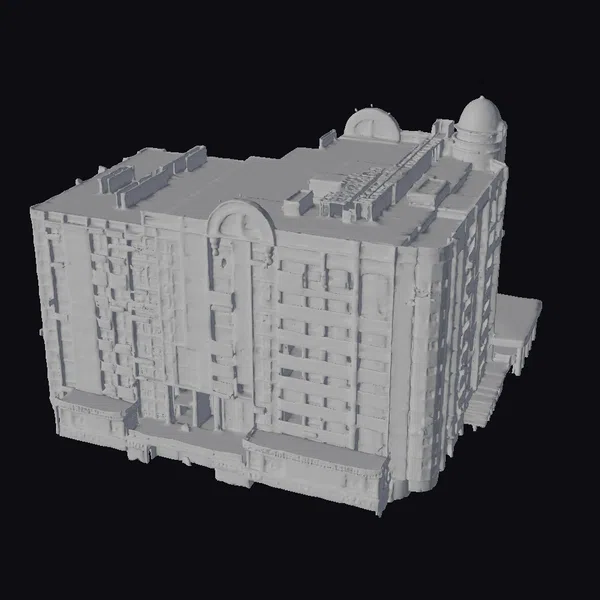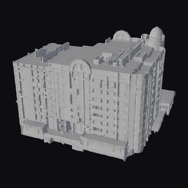 This detailed model showcases a white multi-story building with a symmetrical facade, complete with numerous balconies and windows that add depth and realism. The rooftop is a flat gray expanse, interrupted by mechanical equipment and two prominent domed structures. The base of the building features a distinctive warm-toned ledge, providing a visual break. The model’s clean lines and precise details make it suitable for various applications, including architectural visualizations, urban planning projects, and game environments. Its realistic style allows for immersive integration into real-world or fantastical settings.