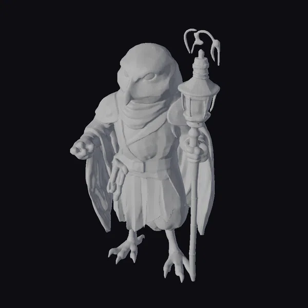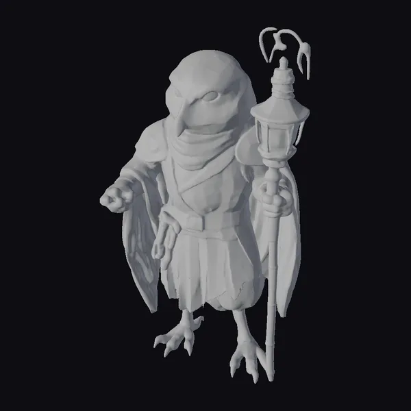 In a majestic pose, the white owl birdfolk stands with an air of wisdom, its white plumage adorned with intricate tan and gold armor and robes. The character’s sharp talons and piercing yellow eyes convey a sense of sharp intellect and ancient power. A glowing lantern atop its staff casts a warm, ethereal light, suggesting guidance through mystical realms. The model showcases detailed textures, from the soft feathers to the ornate metalwork on the staff and armor. Ideal for use in fantasy games, animations, or designs requiring a mystical, otherworldly character, this model brings a touch of magic and mystery to any project.