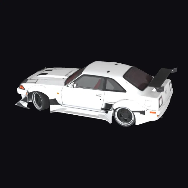 Detailed with precision, this realistic 3D model of a Nissan 180SX (S13) widebody drift car showcases a pristine white finish with black accents and a vibrant red interior. The car’s dynamic pose highlights its sporty design, from the sharp lines of its widebody kit to the imposing rear spoiler. Its lowered stance and black wheels with white rims give it a ready-to-drift appearance. Ideal for use in games, 3D animations, or architectural visualizations, this model brings a touch of high-octane excitement to any project.