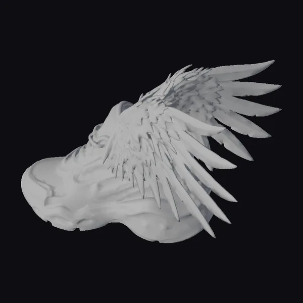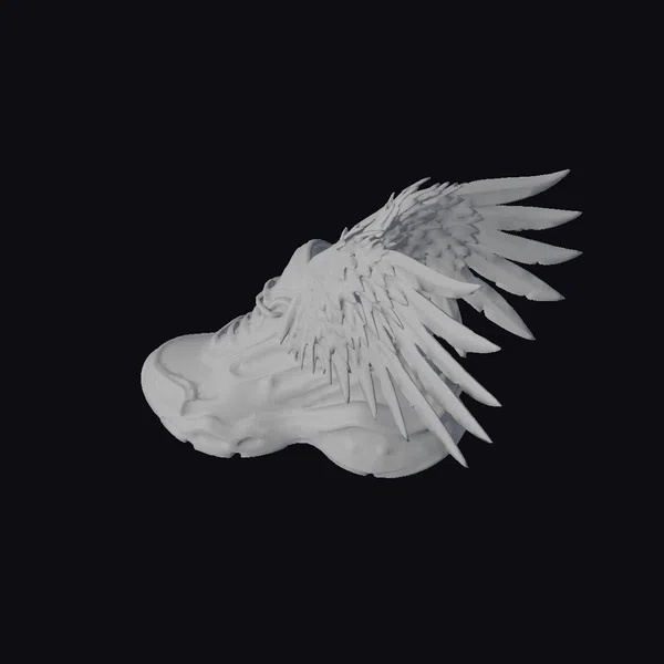 Perched on the edge of motion, this stylized sneaker model boasts a radiant blue upper with a glossy finish, complemented by white laces that add a touch of realism. The shoe’s side is adorned with a magnificent yellow wing, composed of long, spiky feathers that evoke a sense of speed and agility. The gray and yellow sole provides a sturdy base, while the overall design seems to burst with energy. This model is perfect for projects requiring a futuristic or fantastical footwear element, such as animations, games, or architectural visualizations where creative freedom is key.