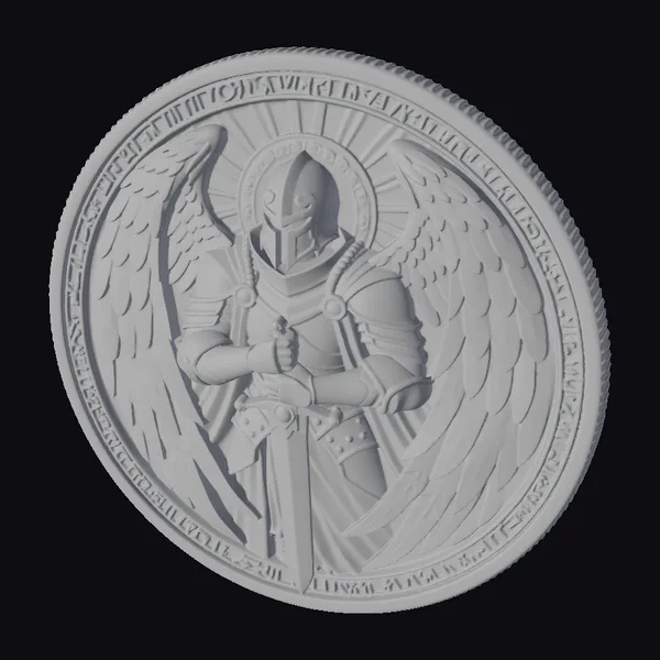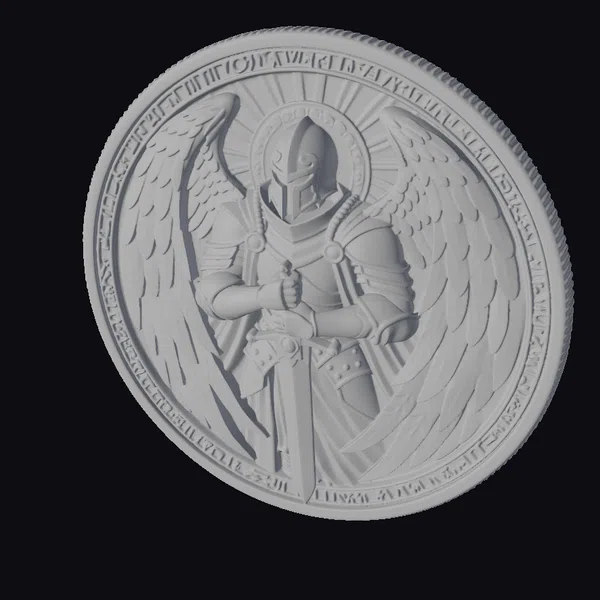 The Winged Knight Shield presents a knight in majestic pose, donning silver armor with golden trimmings and a flowing crimson cape. Large, feathered wings emerge from his back, while a golden halo encircles his helmeted head. Clutching a sword, the knight stands resolute within a circular gold and silver border, adorned with mysterious etchings. The shield’s deep red background enhances the heroic aura. Ideal for use in games, 3D printing, VR/AR experiences, animations, or designs requiring a symbol of courage and honor.
