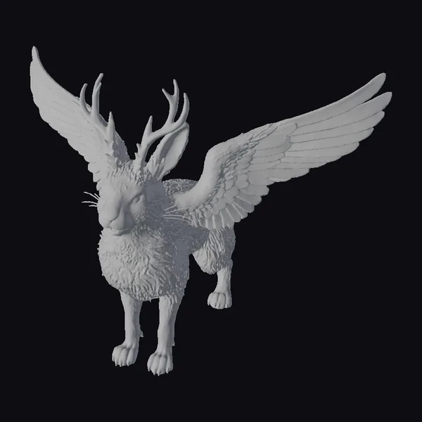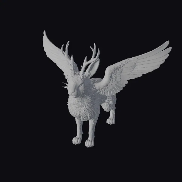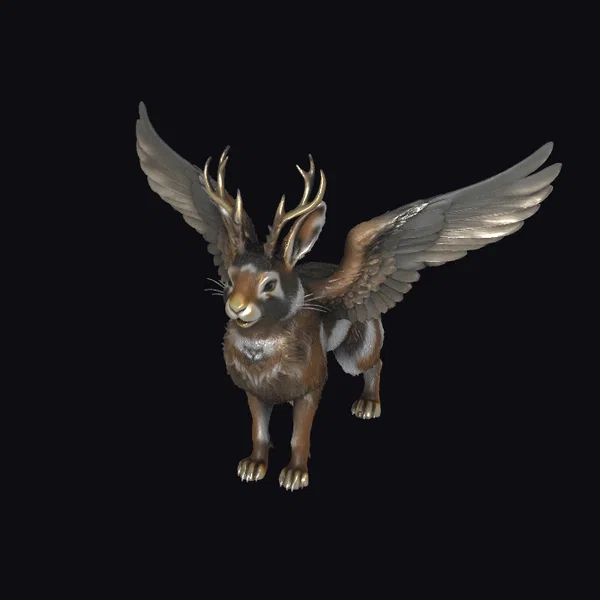 Perched on powerful hind legs, this winged rabbit-deer hybrid exudes a sense of gentle strength. The intricate texture of its fur, a mix of brown and white hues, gives the impression of softness and warmth. Its large, expressive eyes seem to hold a quiet wisdom, while the delicate details of its whiskers and the subtle sheen on its nose add a touch of realism. The antlers, branching out from its forehead like nature’s own crown, speak to its mythical heritage. The wings, with feathers meticulously detailed, stretch out to the sides, capturing the essence of flight. This model would be perfect for animators looking to bring a touch of magic to their projects, for game developers seeking unique creatures to populate their worlds, or for designers aiming to add a whimsical element to their work. Its potential uses are vast, from enhancing a fantasy game’s bestiary to serving as a charming centerpiece in a virtual reality environment.