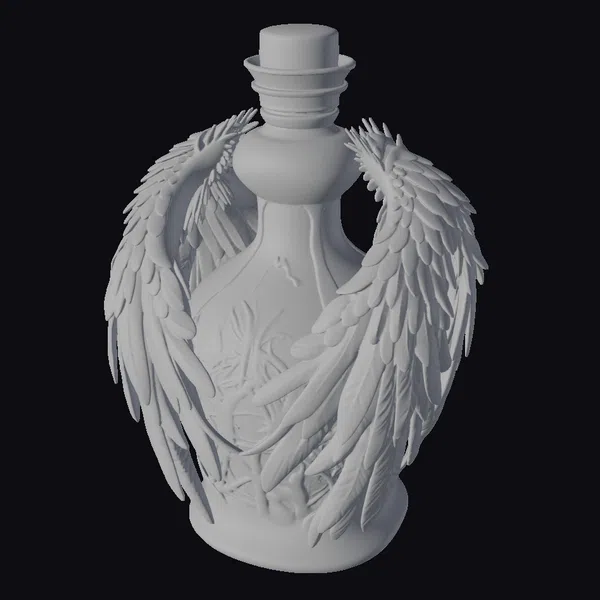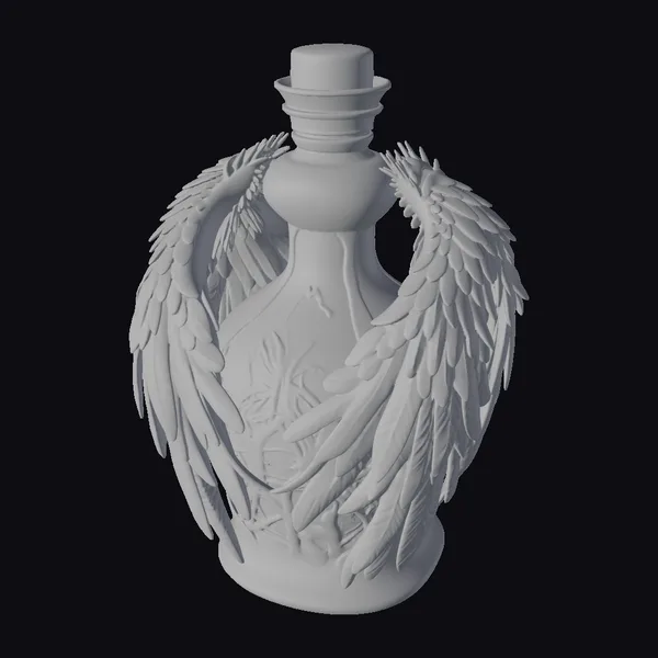 In a majestic pose, the Winged Red Elixir Bottle stands tall, its rounded body adorned with intricate gray feathers that appear to be sprouting from its surface. The transparent red glass glows with an inner light, casting an otherworldly radiance. A cork seals the top of the bottle, adding a touch of realism to this fantastical object. The bottle’s pose showcases its unique features, from the delicate feathers to the glowing liquid within. This model is perfect for use in games, 3D printing, VR/AR experiences, animation, and design projects, where a touch of fantasy and magic is needed.