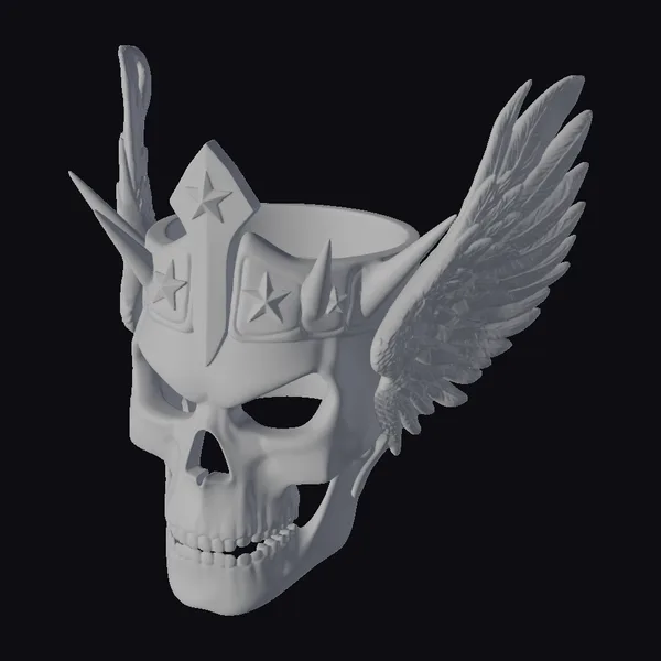 The Winged Skull Crown is a marvel of detailed design, showcasing a silver skull with a hollowed-out top, as if it were a vessel. The skull’s surface is smooth and polished, providing a striking contrast to the golden accents. A stylized crown rests atop the skull, featuring sharp, pointed elements and star-shaped motifs that add to its fantastical allure. The pièce de résistance is the large, golden wing that extends from the side of the skull, its feathers meticulously detailed to create a sense of movement and dynamism. This model is perfect for use in games, 3D printing, VR/AR experiences, animation, and design projects, where a touch of dark fantasy and elegance is desired.