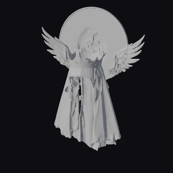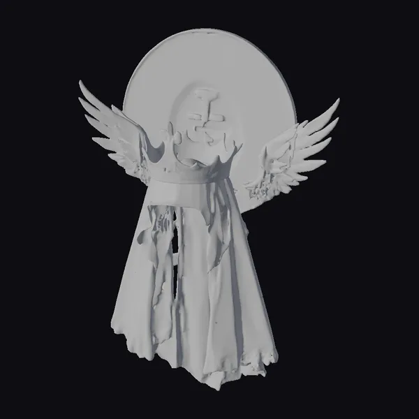 Perched atop a circular base with radiating lines, the Winged Veil Crown exudes regal splendor. The golden crown itself features a cross at its center, flanked by two majestic wings that seem to be in mid-spread. A delicate, star-studded veil flows from the base of the crown, its edges frayed and tattered for a sense of mystique. The entire piece is a masterclass in texture and detail, from the lace trim on the veil to the metallic sheen of the crown. Ideal for use in games, 3D printing, VR/AR experiences, animation, and design projects seeking a touch of fantasy and opulence.