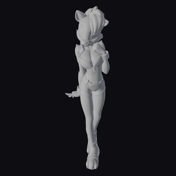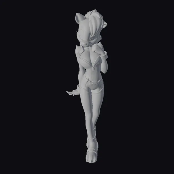 Detailed with precision, this anthropomorphic fox boasts a tantalizing blend of brown, white, and blonde hues in her fur, accentuated by piercing green eyes and a cheeky grin. Her stylish ensemble consists of a blue and white bodysuit with gold trim, a matching blue bow adorning her head, and strappy heels that add a touch of sass to her overall demeanor. The model’s pose, with one hand playfully raised to her face and the other extended outward, exudes a sense of flirtatiousness and whimsy. Her slender physique and dynamic stance make her a captivating addition to any project, from animated films and video games to graphic novels and advertising campaigns.