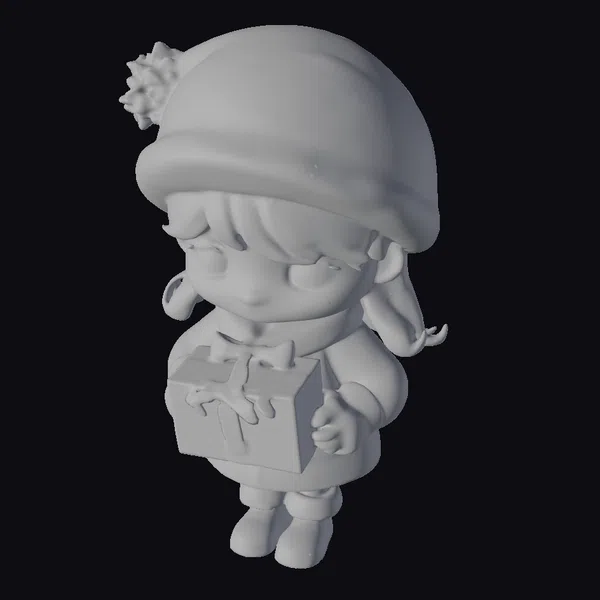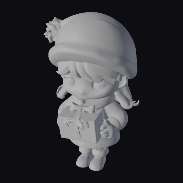 This delightful chibi-style 3D model showcases a female adventurer dressed in cozy winter attire, complete with a snowflake-patterned hat and a teal coat, as she holds an oversized Christmas present. Her brown hair peeks out from under the hat, framing her face with a cheerful smile and inviting brown eyes. The model is highly stylized, with exaggerated features typical of chibi art, making her appear both cute and endearing. The oversized gift, wrapped in red paper with a golden bow and adorned with snowflakes, adds to the festive atmosphere. The model’s pose, with her slightly bent knees and dynamic stance, suggests movement and energy. The high level of detail in the textures, from the fur trim on her hat and coat to the reflective quality of her boots, enhances the model’s visual appeal. This model is perfect for projects requiring a character with a festive and playful vibe, suitable for use in animations, games, VR/AR experiences, and various design applications.