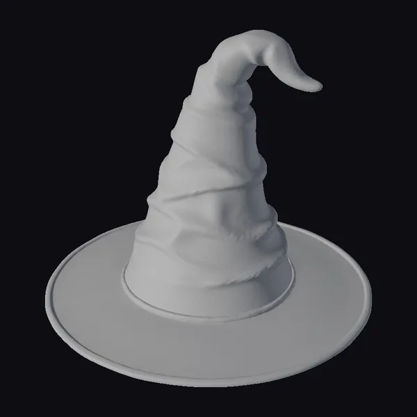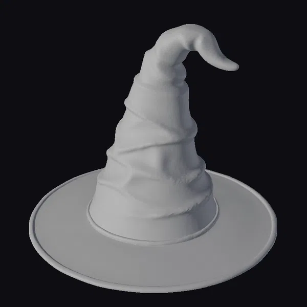 The witch’s hat stands proudly, its base a wide, flat circle that tapers into a tall, spiraling cone. The cone twists and turns, culminating in a pointed tip that curls upwards, adding a whimsical touch to the overall design. The surface of the hat is smooth and slightly shiny, suggesting a material that’s both luxurious and mysterious. As the light catches it, the hat seems to shift and ripple, as if imbued with a life of its own. This model would be perfect for use in games, animations, or 3D prints where a touch of magic and mystery is needed.