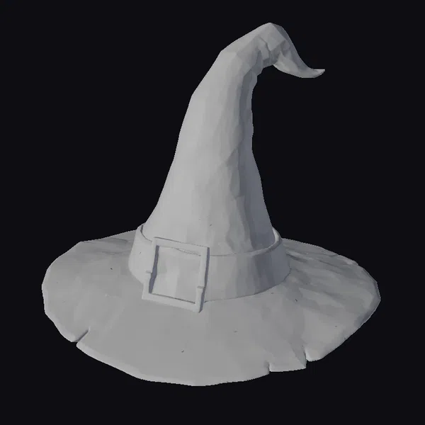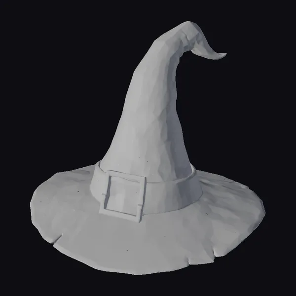 In a dramatic pose, the witch’s hat stands tall, its black fabric seemingly absorbing the light around it. The pointed tip curls upwards, as if beckoning the wearer to cast a spell. The wide brim is evenly curved, with a slight upturn at the edges, giving the hat a sense of dynamic movement. A gold buckle shines brightly on the hatband, its square shape and smooth surface a striking contrast to the hat’s organic curves. The buckle’s presence adds a touch of sophistication to the hat’s overall design, making it a compelling addition to any witch’s wardrobe. Whether used in a game, animation, or 3D print, this hat is sure to cast a spell of enchantment.