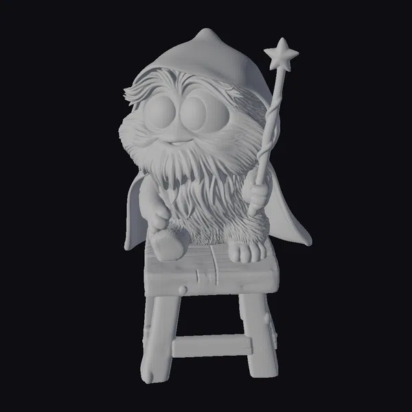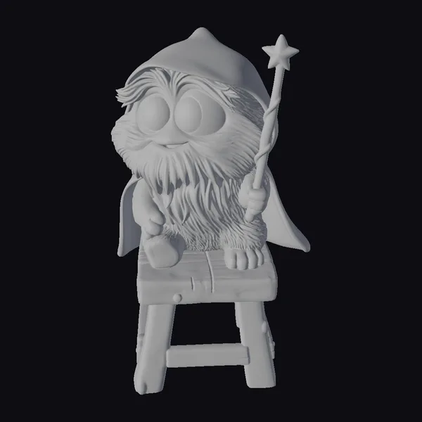 In a pose that invites the viewer into a world of fantasy, a furry little wizard creature sits atop a sturdy wooden stool, its rustic texture suggesting a tale of ancient, mystical forests. The creature itself is a marvel of whimsical design, with fur that gradates from soft pink to rich purple, complemented by a fluffy white beard and eyebrows that add to its wise and mystical appearance. Its large, round eyes are a window to a magical soul, shining bright with wonder and a hint of mischief. Adorned in a flowing purple hooded cape, the creature holds a wand tipped with a star, a symbol of its magical prowess. The stool, with its simple yet sturdy design, grounds the scene in a sense of rustic charm, while the creature’s attire and accessories transport the viewer to a realm of fantasy and magic. This model is perfect for projects that require a touch of whimsy and enchantment, such as animations, games, or virtual reality experiences.