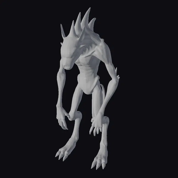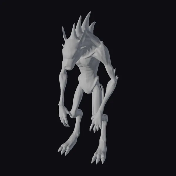 Standing poised in a threatening stance, this fantastical creature showcases a blend of terrifying and mesmerizing features. Its wolf-like body is devoid of fur, showcasing smooth, semi-glossy bluish-grey skin that catches the light like the surface of wet stone. The creature’s physique is muscular and lean, with visible definition in its chest and limbs, suggesting powerful movement and strength. A series of sharp spikes runs along its back, complementing the spikes on its head and adding to its fearsome appearance. One of the most striking features of this creature is its numerous small eyes, which are scattered across its face, giving it a unique and somewhat unsettling appearance. Its sharp claws are visibly long and dangerous, perfect for tearing through obstacles or adversaries. The creature’s overall design makes it an excellent addition to any fantasy setting, suitable for use in games, 3D printing projects, virtual reality experiences, animations, or design concepts where a menacing creature is needed.