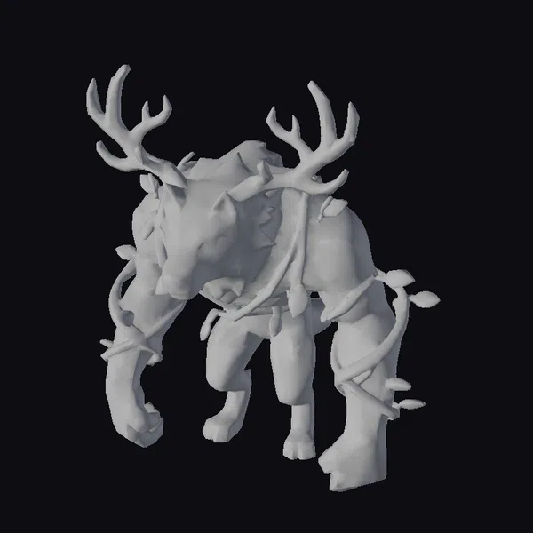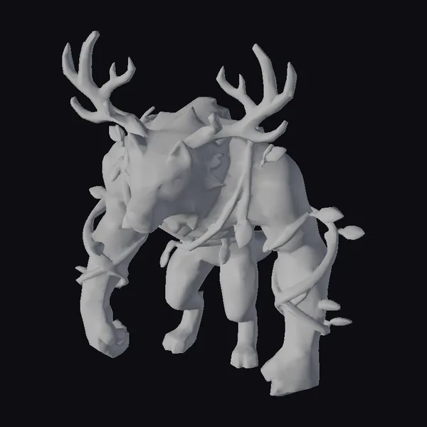 Detailed with precision, this stylized wolf creature boasts a brown and gray fur with white accents, complemented by green patches that seem to blend with the entwining vines. Its antlers, a marvel of crystalized bark, reach upwards with icicle-like formations at their tips. Glowing spores scattered across its body emit a soft, luminescent light, enhancing its mystical aura. The low-poly art style gives it a modern, stylized look, making it perfect for projects requiring a touch of fantasy and nature’s magic. Suitable for use in games, animations, virtual reality experiences, and design projects where a mythical creature is needed.
