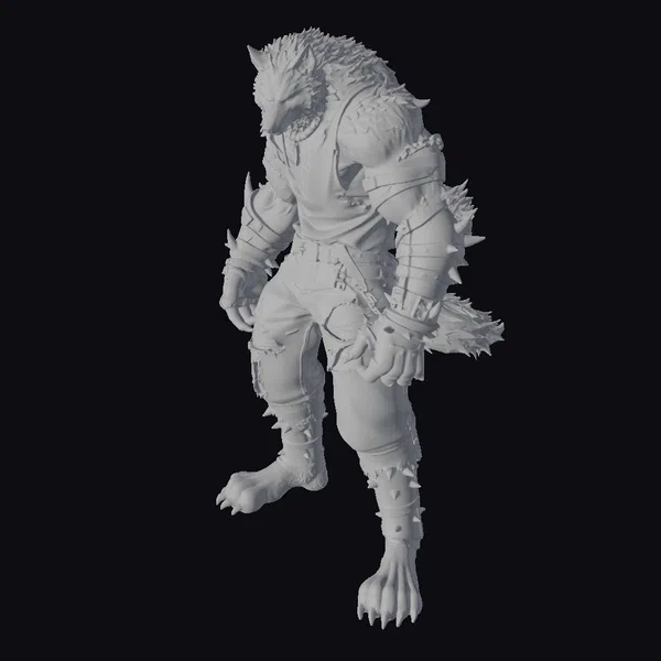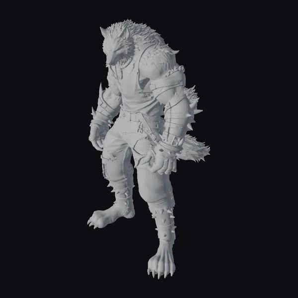 Standing tall with a powerful stance, this wolfman warrior boasts a detailed, furry physique with a predominantly gray coat and sharp, pointed ears. The character’s facial features are accentuated by a snarl, revealing sharp teeth, while its eyes glow with an eerie light. Adorned in dark, spiky armor on its arms and legs, along with ripped and distressed teal pants, the wolfman exudes a battle-hardened appearance. The model showcases intricate textures, including the wolf-like fur, muscular definition, and the weathered look of its armor. Ideal for use in games, animations, or 3D print projects that require a compelling, mythical creature, this model brings a dynamic and intense character to any scene.