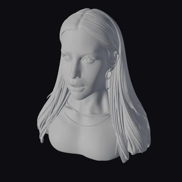Positioned in a straightforward pose, this woman bust presents a captivating visage, her facial features meticulously rendered to convey a sense of serenity and poise. The model’s long, dark hair is parted down the middle, with subtle streaks of gold that add a touch of warmth and depth to her appearance. Her blue eyes are strikingly detailed, complemented by pink lips that add a pop of color to her otherwise natural complexion. The glossy skin texture and the way light reflects off her surface enhance her lifelike appearance. Adorned with gold jewelry, including a layered necklace and large hoop earrings, she embodies a blend of modern fashion and timeless elegance. This model is perfect for use in games, 3D printing, VR/AR experiences, animation projects, and design visualizations, offering a versatile and high-quality asset for creators.