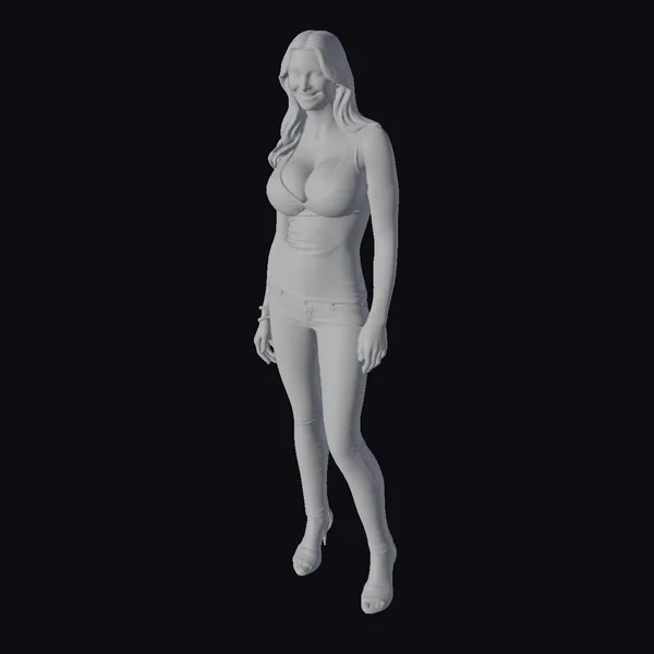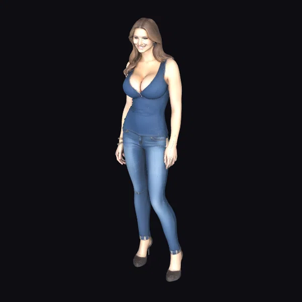 Detailed in every aspect, this 3D model of a woman showcases a poised individual dressed in a stylish blue denim ensemble. The outfit consists of a form-fitting top and jeans, accentuating her figure, and is complemented by a pair of black heels that add a touch of elegance. Her long, flowing brown hair and warm, inviting smile contribute to a captivating presence. The model’s pose, with one leg slightly forward, suggests a dynamic yet relaxed demeanor. The realistic style and attention to detail make this model suitable for various applications, including game development, animation projects, virtual reality experiences, and architectural visualizations where human presence is required. The model’s high-quality textures and lifelike appearance ensure a seamless integration into any digital environment.