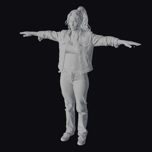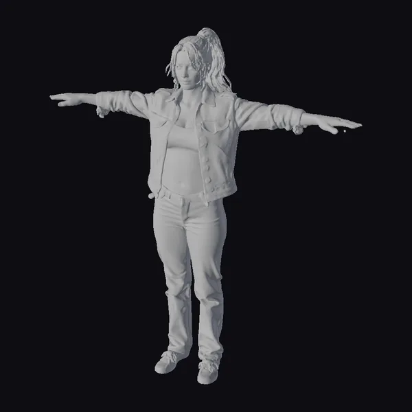Detailed in every aspect, this 3D model of a woman showcases a realistic character with a casual flair. She stands with her arms outstretched, wearing a light gray leather jacket that is slightly open, revealing a black top underneath. Her blue jeans are fitted well, and her sneakers are a perfect complement to her overall look. The blonde hair is styled in a loose ponytail, framing her face with a few strands falling freely. This model is ideal for various applications, including games, 3D printing, VR/AR experiences, animation, and design projects, where a realistic yet casual human character is needed.