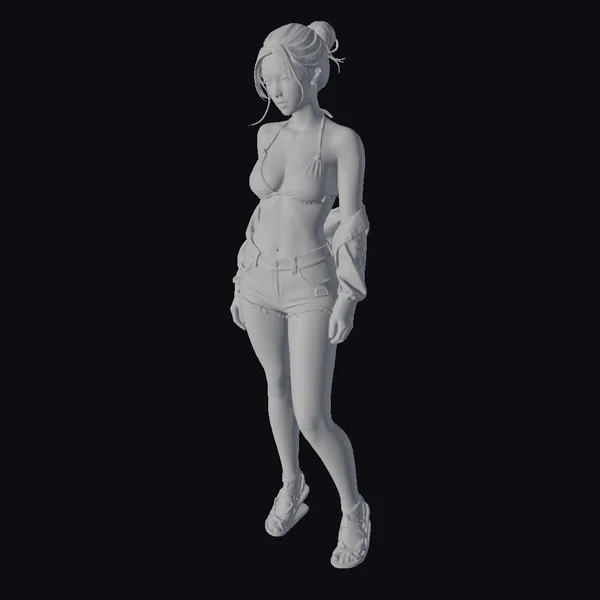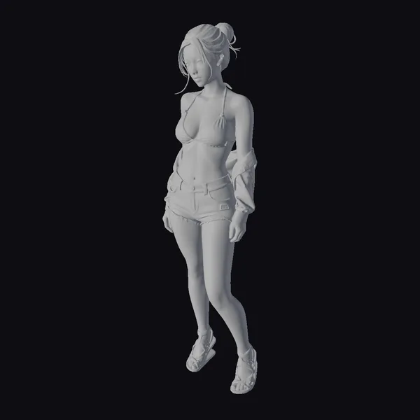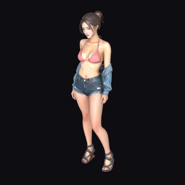 Rendered in exquisite detail, this stylized 3D model captures a young woman in a serene pose, donning a pink bikini top, denim shorts, and sandals, with a denim jacket casually slung over her shoulders. Her dark hair is neatly tied up in a bun, and she sports a subtle, enigmatic smile. The model’s proportions are well-balanced, with a focus on a realistic yet stylized representation. The textures are smooth and detailed, with a slight sheen to suggest a sun-kissed glow. This model is perfect for use in various applications, including games, animation, virtual reality, and design projects, where a relaxed, summer-inspired character is needed.