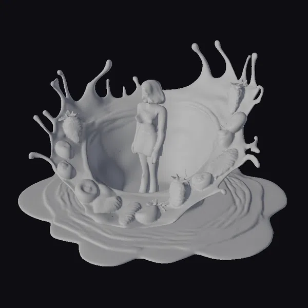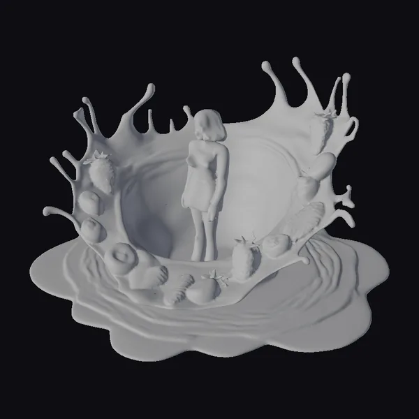 In a mesmerizing blend of surrealism and culinary fantasy, a woman stands poised within a whirlpool of chocolate, her cream-colored dress fluttering gently around her. The chocolate vortex, adorned with an assortment of vibrant fruits including strawberries, blueberries, and sliced apples, appears to be pulling everything towards its center. The woman’s dark hair and calm demeanor provide a striking contrast to the dynamic, swirling chocolate. This 3D model is perfect for artists and designers looking to add a touch of surreal elegance to their projects, whether it’s for animation, game design, or virtual reality experiences.