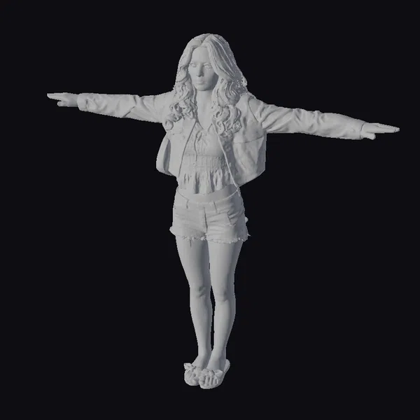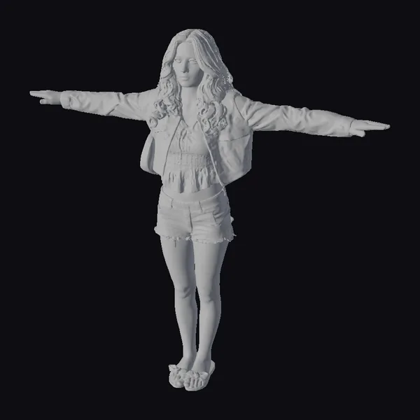 Standing tall with her arms outstretched, this young woman embodies a sense of freedom and joy. Her long, wavy brown hair cascades down her back, framing her face with soft, gentle curves. The denim jacket and shorts combination gives her a casual, laid-back vibe, perfect for a warm day out. She pairs these with a crisp white top and sleek black sandals, adding a touch of simplicity to her overall look. A small black bag hangs casually over her shoulder, suggesting she’s ready for a day out. This 3D model captures every detail, from the texture of the denim to the shine on her sandals, making it perfect for use in games, 3D print projects, VR/AR experiences, animations, or design visualizations.