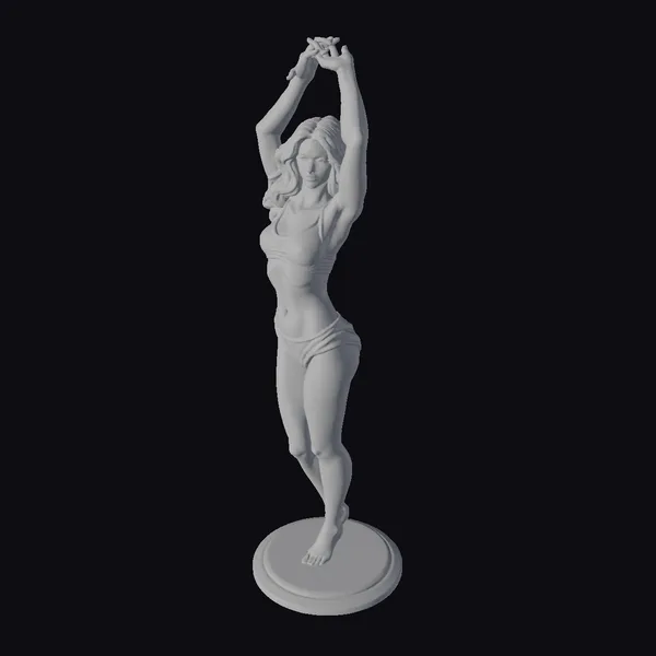 Gaze upon a woman poised in a moment of pure joy, her arms stretched above her head, hands delicately touching. Her long, wavy hair flows like a river of gold down her back, framing her face and complementing her bright orange bikini. The realistic detailing is stunning, from the soft folds of her skin to the intricate strands of her hair. The figure stands on a round base, its earthy tone accented with a vibrant orange rim, echoing the color of her bikini. This model is perfect for those looking to add a touch of elegance and joy to their projects, whether it’s for game development, animation, or architectural visualization. Its high level of detail makes it suitable for close-up shots, allowing viewers to appreciate the beauty and tranquility of the scene.