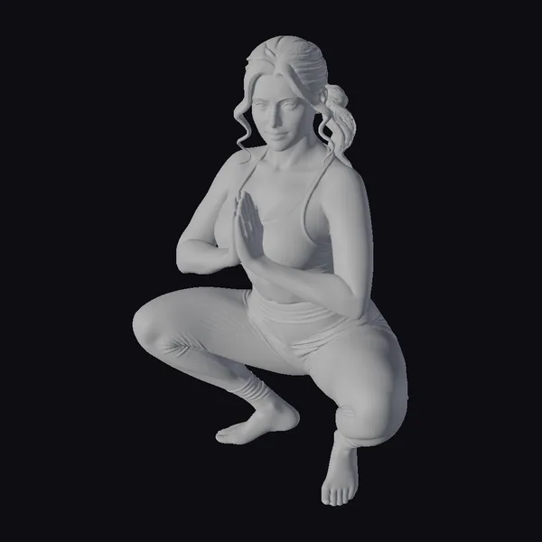 In a majestic pose, the woman’s hands are pressed together in front of her chest, exuding a sense of calm and concentration. Her dark hair flows gently back, secured in a low ponytail, while her eyes are cast downward, focusing inward. The pink yoga outfit is meticulously detailed, showcasing a sports bra and leggings that highlight her athletic physique. The 3D model’s realistic proportions and textures bring a lifelike quality, making it perfect for projects requiring a serene and focused character. Ideal for use in games, animation, VR/AR experiences, and design projects where a tranquil yet dynamic human presence is needed.
