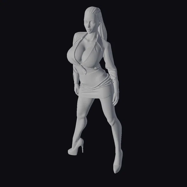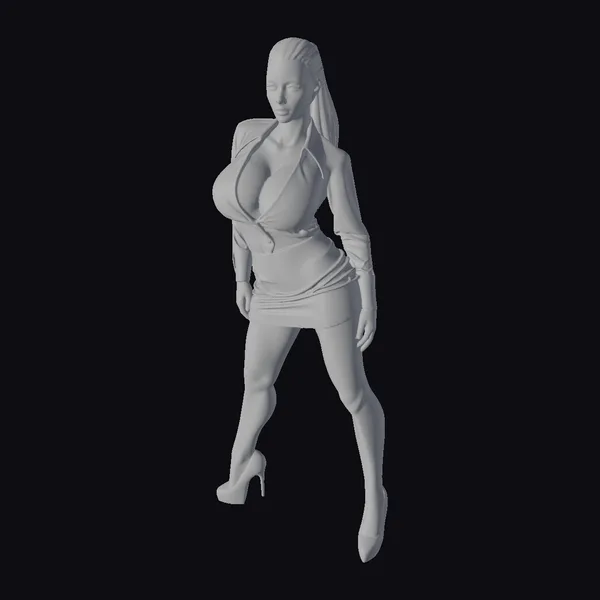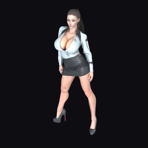 This 3D model captures a woman in a powerful stance, exuding confidence and style. She is dressed in a light blue, partially unbuttoned top that reveals a hint of her cleavage, paired with a short, dark leather skirt that adds a touch of sophistication. Her long, dark hair is neatly pulled back into a high ponytail, showcasing her face and highlighting her bright, inviting smile. The model is wearing black high heels, which elongate her legs and complete her fashionable look. The stylized rendering emphasizes her curves and posture, making her a compelling character for various creative projects. The model’s design and pose make her suitable for use in animations, games, virtual reality experiences, and other digital media where a confident, fashionable character is needed.