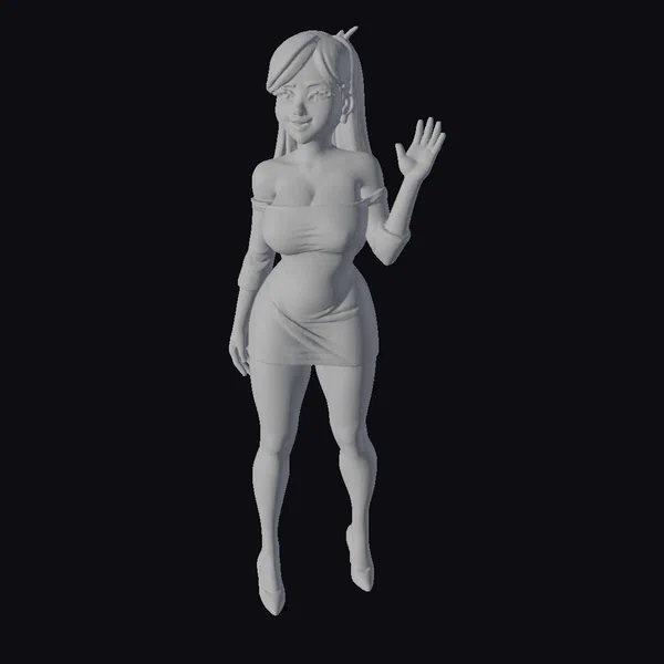 Detailed from head to toe, this cartoon-style woman boasts long brown hair, styled with a small hair clip on top, framing her smiling face. Her red, off-the-shoulder dress appears to be made of a shiny, leather-like material, accentuating her pose. With one hand casually by her side and the other waving, she wears black heels that complement her outfit. Her facial expression is friendly, with rosy cheeks adding to her charm. The model is well-proportioned, with attention to detail in her anatomy. She can be used in various projects, such as animations, games, or virtual reality experiences, bringing a lively character to any scene.
