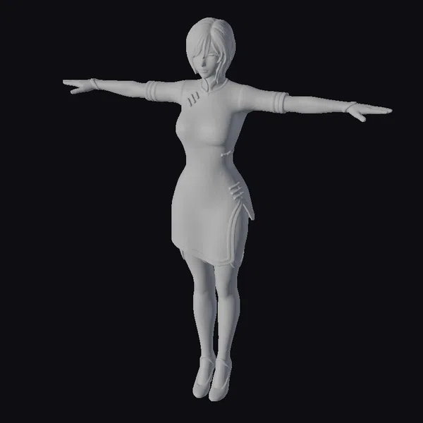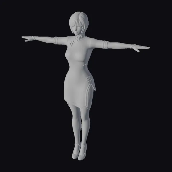 Depicted in a dynamic pose with arms outstretched, this stylized female character showcases a short, teal dress with a glossy finish. The dress boasts a high neckline and a side slit, accentuating her figure. Her blue hair is cut in a stylish, short style, framing her face. The character’s gray stockings and heels add a touch of sophistication to her overall appearance. The model’s proportions are well-balanced, with detailed textures that enhance her anime-inspired look. This 3D model is suitable for various applications, including games, animation, virtual reality (VR), and augmented reality (AR) projects, as well as 3D printing and design visualizations.