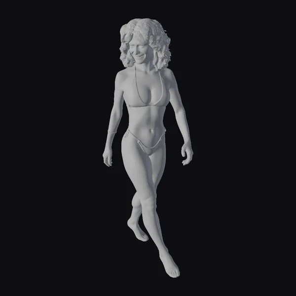 Gazing downward with a gentle smile, this woman exudes confidence and poise in her white bikini. Her curly brown hair flows down her back, framing her face with soft, flowing locks. The subtle sheen on her skin catches the light, adding depth and dimension to this already stunning 3D model. Her pose, with one leg crossed over the other, conveys a sense of relaxed elegance. This model is perfect for use in various applications, including games, animation, print media, and virtual reality experiences, where a realistic and captivating human character is needed.