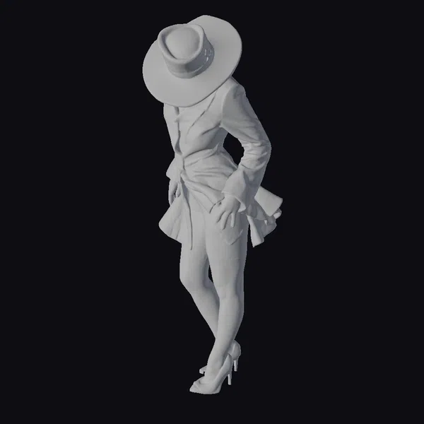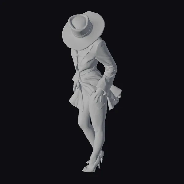 In a dynamic stance, the woman’s white jacket flows around her, complemented by a wide-branched hat that adds a touch of mystery. Her short skirt and high heels create a striking contrast, while the detailed textures of her clothing and accessories showcase the model’s high fidelity. The realistic lighting highlights her form, making her a compelling subject for various applications, including games, animation, and design projects. Her poised demeanor and stylish attire make her an excellent choice for projects requiring a sophisticated character.