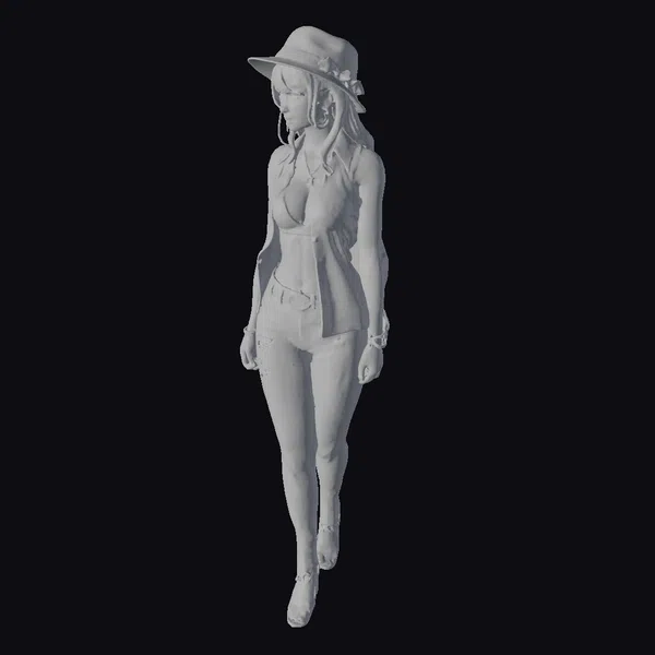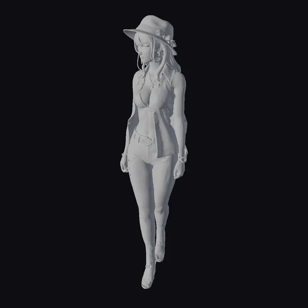 In a pose that commands attention, the woman stands tall, her white outfit with a black pattern making a statement. The ensemble consists of a halter top, vest, and torn jeans, all featuring the same eye-catching design. Her accessories, including a wide-brimmed hat, sandals, and multiple pieces of jewelry, add to her stylish appearance. The tattoos on her arms and the sunglasses perched on her forehead contribute to her edgy yet fashionable look. This 3D model is perfect for use in games, animations, or as a design reference, offering a blend of style and detail that can enhance any project.