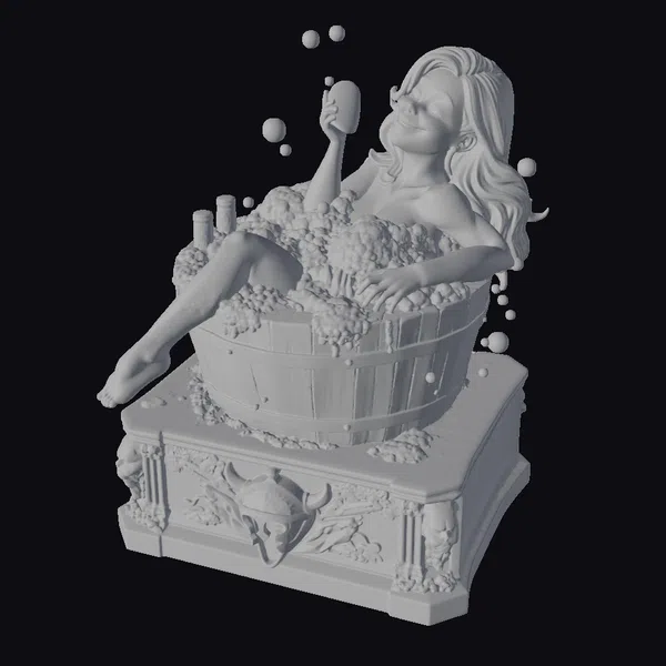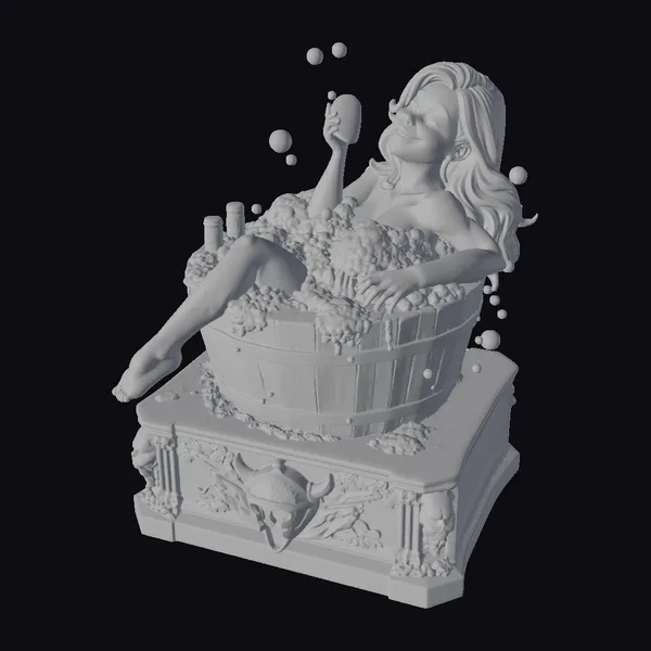 In a scene that epitomizes relaxation, a woman with flowing blonde hair reclines in a wooden bathtub, her body adorned with soap bubbles that cling to her skin and hair. The bathtub, complete with metal bands, sits atop an ornate stand with golden accents, adding a touch of luxury to the serene setting. Bubbles of soap float in the air around her, and a bottle of soap rests on the edge of the tub, within easy reach. This stylized model captures a moment of calm and self-care, perfect for projects requiring a serene and peaceful character or scene. The detailed textures and pose make it suitable for various applications, including games, animation, and 3D printing.