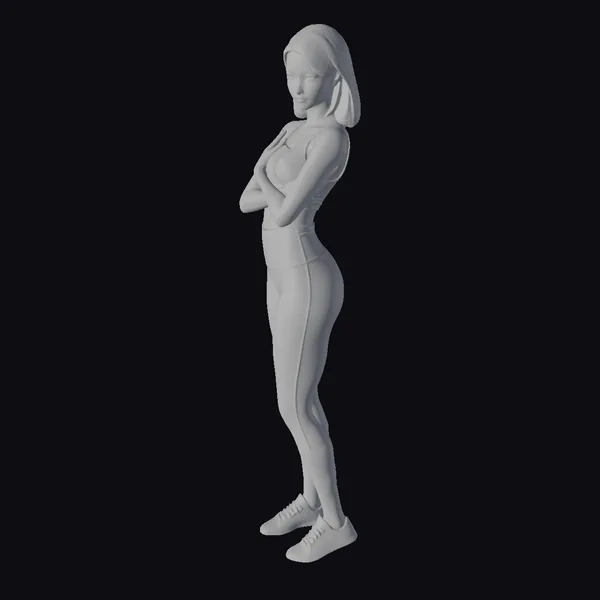 Rendered in exquisite detail, the young woman’s pose showcases her toned physique, accentuated by her fitted yoga gear. Her blonde hair falls just above her shoulders, framing her heart-shaped face and brightening her overall appearance. The soft, pastel pink flowers on her leggings add a touch of playfulness to her outfit, while her black sports bra and shoes maintain a sleek, athletic vibe. Her arms are crossed over her chest, exuding a sense of calm confidence. This 3D model is perfect for projects requiring a realistic, feminine character, such as games, animation, or design work.
