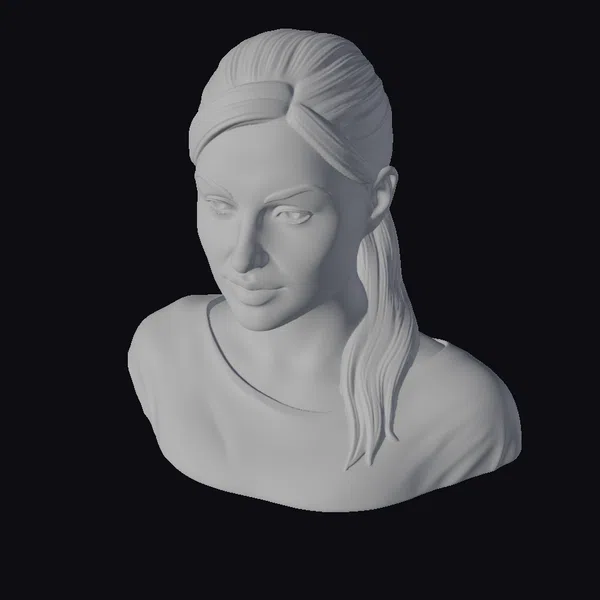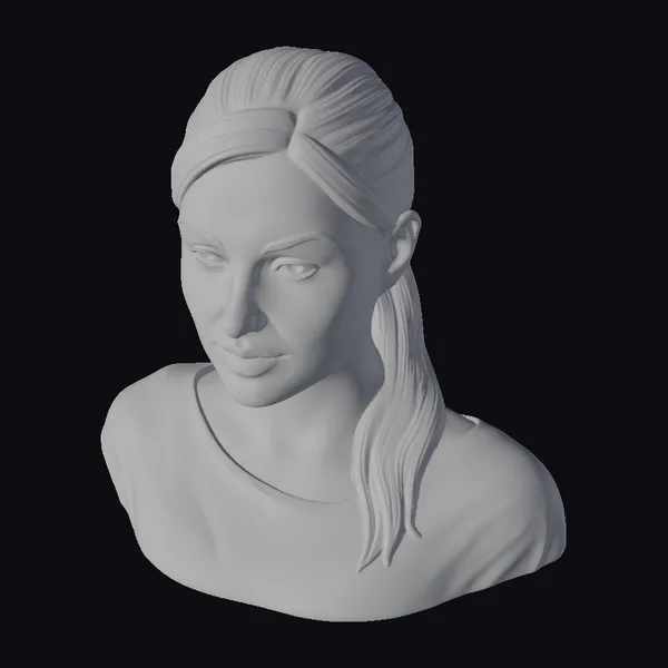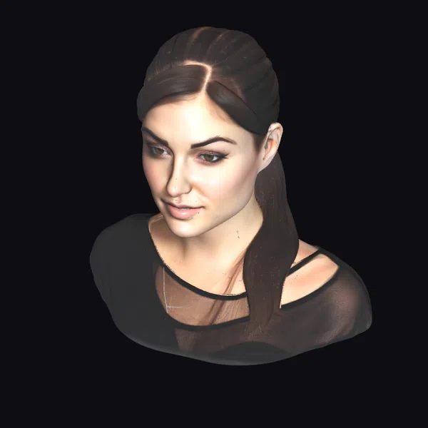 This captivating portrait features a woman with a strong, enigmatic presence. Her dark hair is parted down the middle and pulled back, revealing a smooth, pale complexion and a determined expression. The subject’s eyes seem to hold a thousand secrets, drawing the viewer in with an unblinking stare. She wears a black mesh top with cutouts at the shoulders, adding a layer of depth and visual interest to the overall composition. The subtle play of light on her features creates a sense of volume and dimensionality, making this 3D model perfect for use in games, animation, print, VR/AR, and design applications.